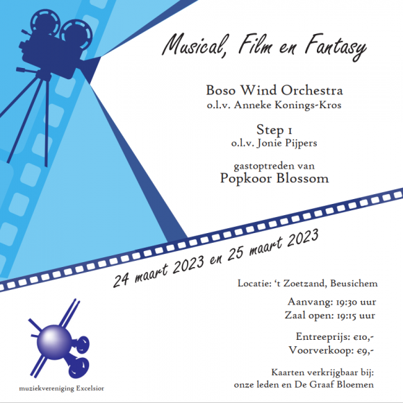 Op vrijdag 24 en zaterdag 25 maart geeft Muziekvereniging Excelsior haar jaarlijkse voorjaarsconcert. Dit jaar nemen wij u mee in de wereld van Musical, Film en Fantasy. Van Pirates of the Caribbean tot Beauty and the Beast. Uiteraard hebben we ook weer een gast uitgenodigd. Dit jaar zal popkoor Blossom samen met Excelsior en zelf een aantal nummers verzorgen. De presentatie is in handen van Danny Steenis en Manon Nieuwenhuisen.