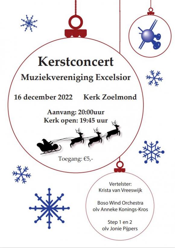 Op vrijdagavond 16 december geeft Muziekvereniging Excelsior een kerstconcert. Tijdens het concert zal zowel het opstaporkest Step1 als de harmonie, het Boso Wind Orchestra optreden.