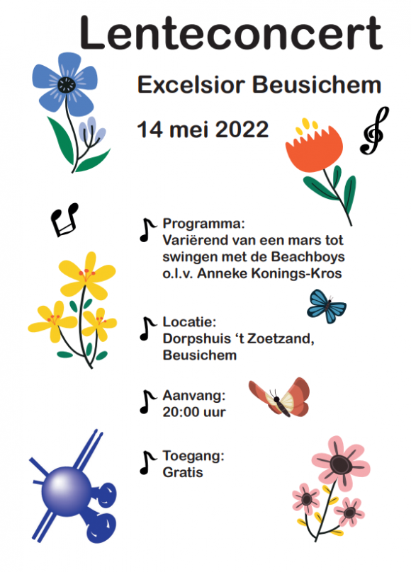 Op zaterdag 14 mei geeft Muziekvereniging Excelsior een lente concert. Na een lange periode mag de harmonie in Beusichem eindelijk weer een optreden voor publiek verzorgen. Het programma zal variërend zijn, van een mars tot swingen met de Beachboys. Het concert wordt gegeven in Dorpshuis ’t Zoetzand te Beusichem en begint om 20.00 uur. De toegang is gratis. Het belooft een gezellige muzikale avond te worden, dus wij hopen u te mogen verwelkomen tijdens het concert.