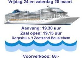 Muziekvereniging Excelsior Beusichem neemt u op vrijdag 24 en zaterdag 25 maart mee op een muzikale cruise over de hele wereld. Dorpshuis ’t Zoetzand in Beusichem wordt omgetoverd tot een heus cruiseschip.